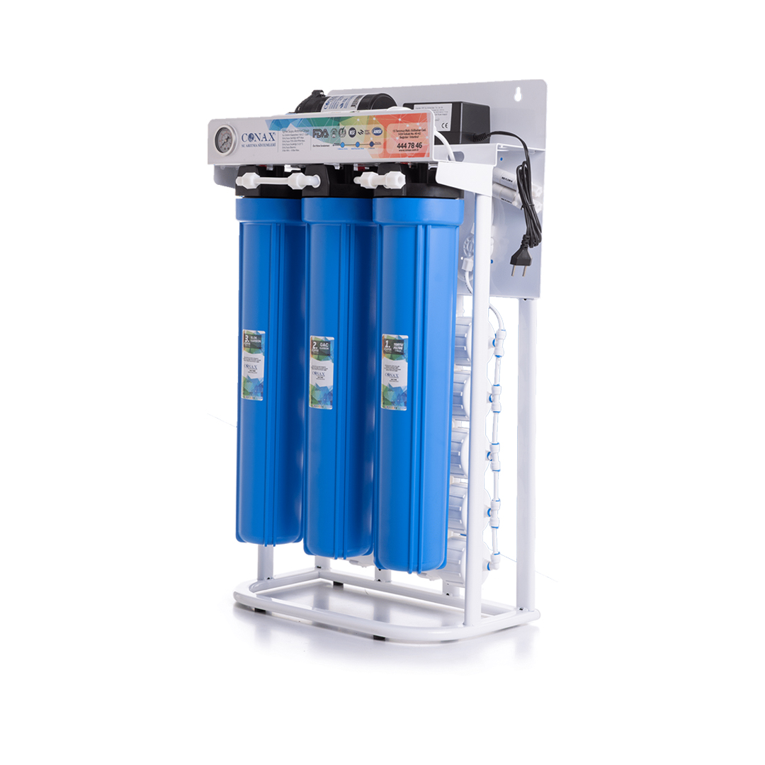 Yüksek kapasiteli bir işyeri su arıtma cihazı olan Conax 500 GPD su arıtma cihazı, ters osmoz teknolojisine sahip bir cihazdır. 5 aşamalı bir filtreleme sistemine sahip olup, yüksek kalitede ve lezzette içme suyu elde eder. Saatte 39 LT lik kapasitesi ile günde 939 LT içme suyu arıtan Conax 500 GPD su arıtma cihazı, 80 LT basınçlı bir tanka sahiptir. Günde 49 damacana su arıtarak işyerlerine son derece önemli bir tasarruf sağlar. Cihaz kendisini iki aydan çok daha kısa sürede amorti etmektedir. İşyerlerinde içme suyu tüketimi evlere göre çok daha fazladır. Bu nedenle işyerlerine özel yüksek kapasiteli arıtma cihazları üretilmiştir. İşyerleri için geliştirilen su arıtma cihazları içinde Conax 500 GPD cihazlar, kapasite ve fonksiyonellik bakımından bir işyerinin tam aradığı arıtma cihazıdır. Hazır su alımını kesen ve işyerinin tüm içme suyu ihtiyacını karşılayan cihaz yüksek kalitede, kireçsiz ve sağlıklı su temininde bir numaradır. Vücudun temel enerji kaynağı olan su işyeri çalışanları için çok önemlidir. Çalışma verimliliğini arttırır ve yeterince alındığında dikkat aralığını büyüterek çalışanların yüksek performansla çalışmasını sağlar.